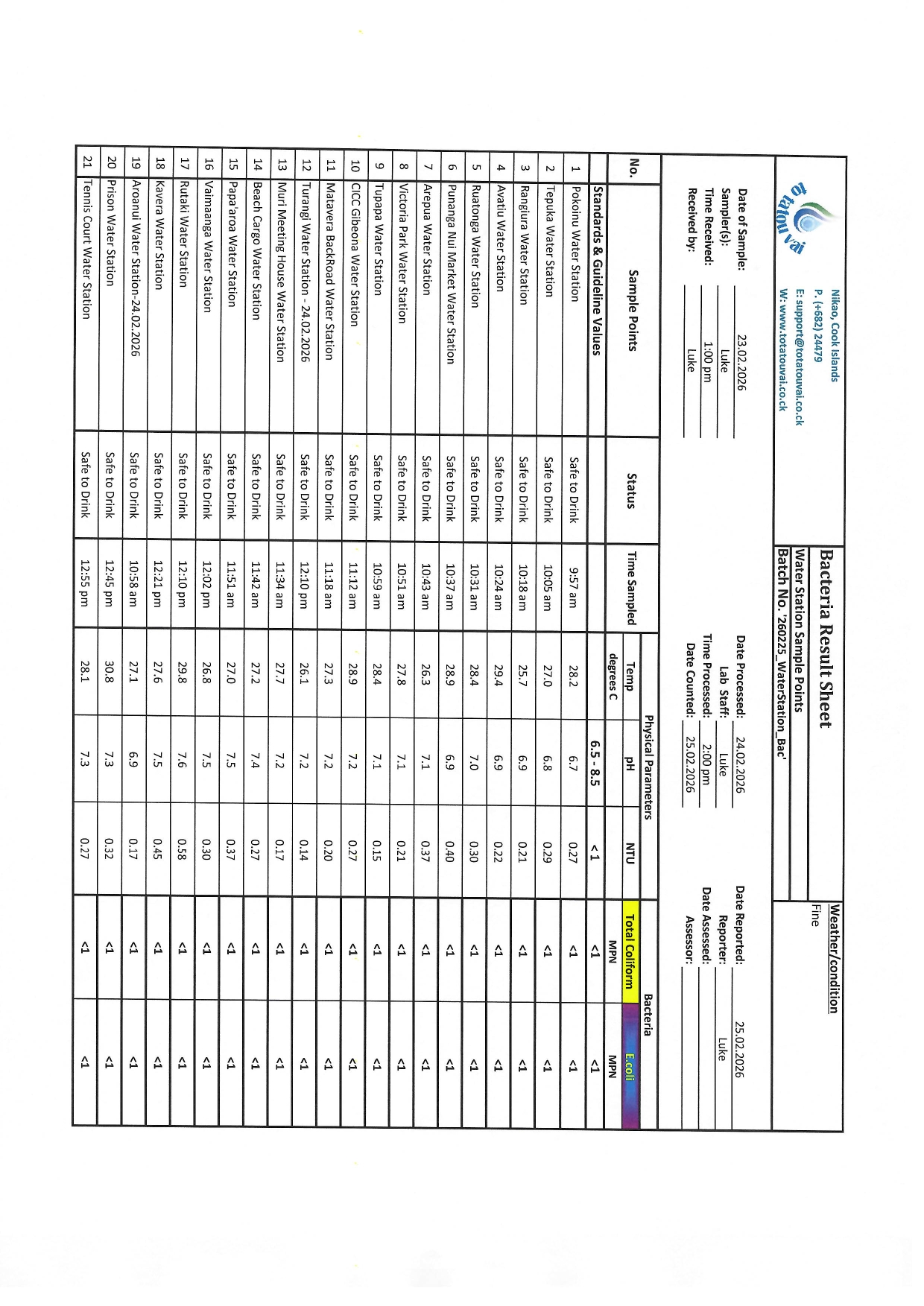Water Station Test Results